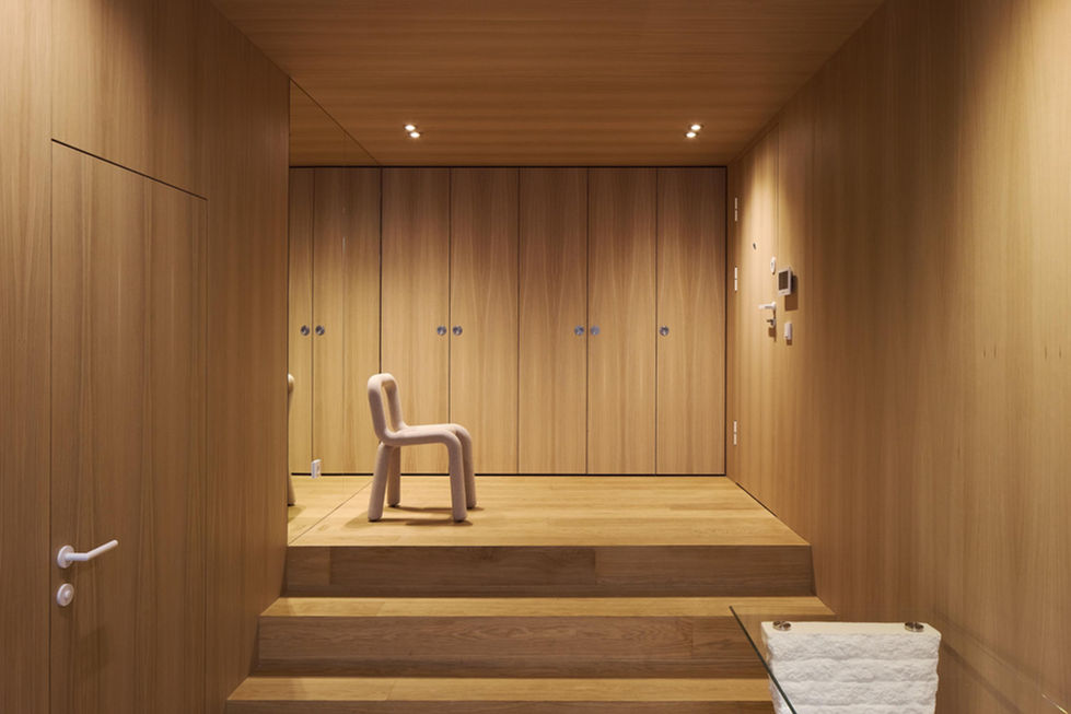 Druskininkų širdyje, unikaliame buvusiame restorano pastate, kurio architektūrą atnaujino KAParchitects, projektavome ir penkių vidaus apartamentų interjerą. Vienas iš jų įpatingai unikalus. Bendra apartamento erdvė yra per du aukštus ir per visą šią erdvę yra esamas stiklinis stogas. Nuolatos skirtingai krintanti šviesa ir šešėliai per stogą, sukuria skirtingas atmosferas. Erdvėje pakabintas tinklas suteikia galimybe pasimėgauti šiuo efektu, lyg kabant ore.